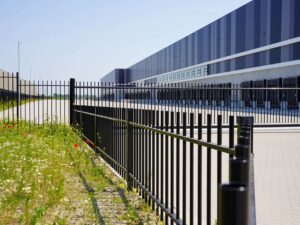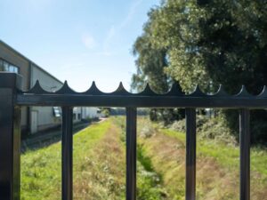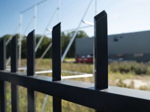 • Vandalism-resistant steel fencing with square, penetrating bars. The bar panels consist of vertical, round bars that penetrate the horizontal beams.