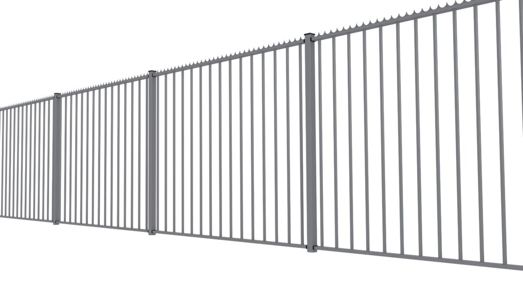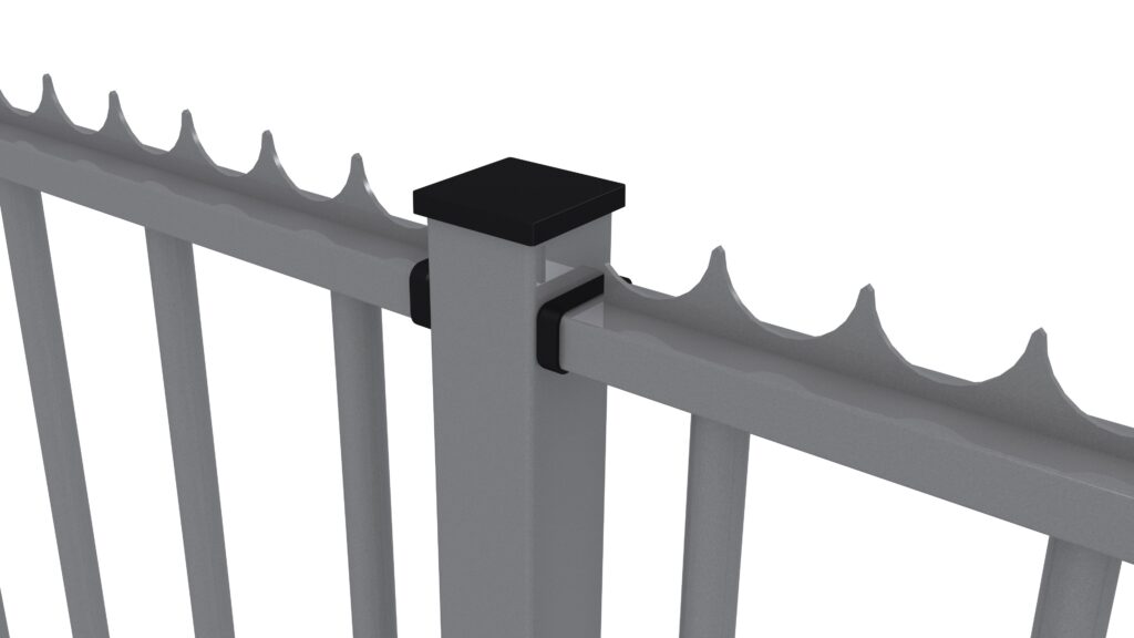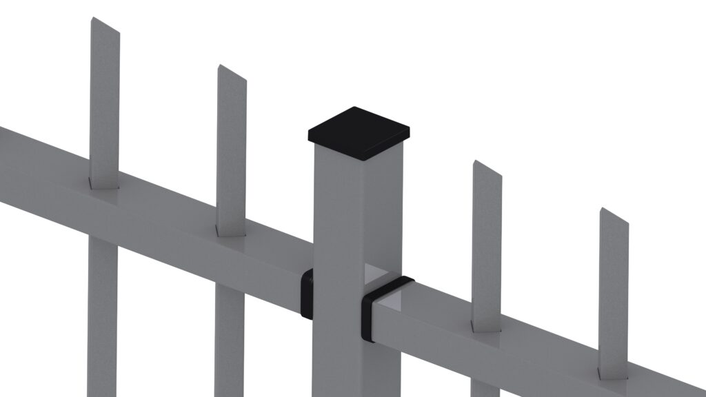 The bar fencing is constructed from bar panels that are blind-mounted to the posts, ensuring a seamless and secure connection.